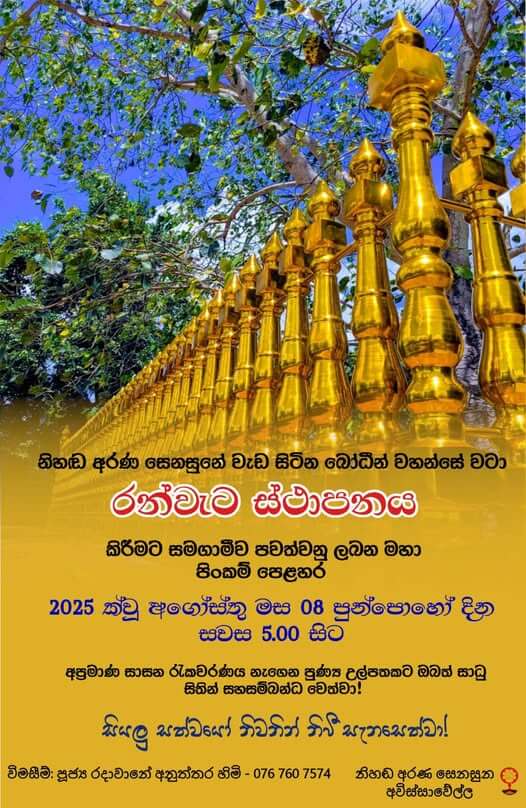 නිහඬ අරණ සෙනසුනේ අභිනවයෙන් ඉදිකරන ලද රන් වැට ශාසනයට පූජා කිරීමේ මහා පිංකම, මෙම link එක ඔස්සේ නැරඹිය හැක: රන්වැට ස්ථාපනය කිරීමට සමගාමීව පවත්වනු ලබන මහා පින්කම් මාලාව | නිහඬ අරණ සෙනසුන – අවිස්සාවේල්ල – YouTube