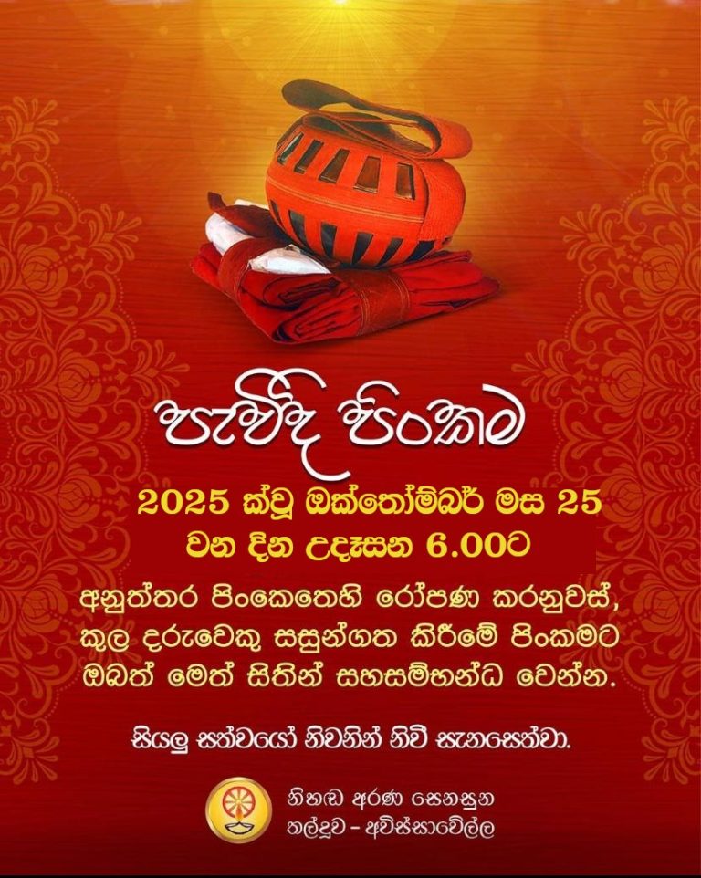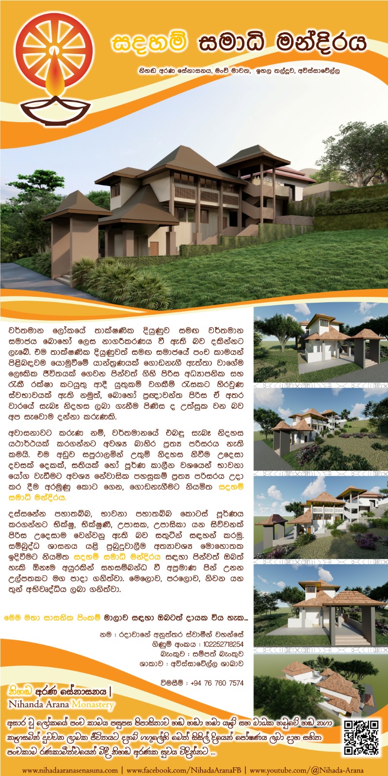 දස්සනේන පහාතබ්බ, භාවනා පහාතබ්බ කොටස් පූර්ණය කරගන්නට භික්ෂු, භික්ෂුණී, උපාසක, උපාසිකා යන සිව්වනක් පිරිස උදෙසාම වෙන්වනු ඇති බව සතුටින් සඳහන් කරමු. සම්බුද්ධ ශාසනය යළි පුබුදුවා ලීම අත්යාවශ්ය මොහොතක ඉදිවීමට නියමිත සදහම් සමාධි මන්දිරය සඳහා පින්වත් ඔබත් හැකි ඕනෑම අයුරකින් සහසම්බන්ධ වී අප්රමාණ පින් උනන උල්පතකට මග ගනිත්වා. මෙලොව, පරලොව, නිවන යන තුන් අභිවෘද්ධිය ලබා ගනිත්වා.